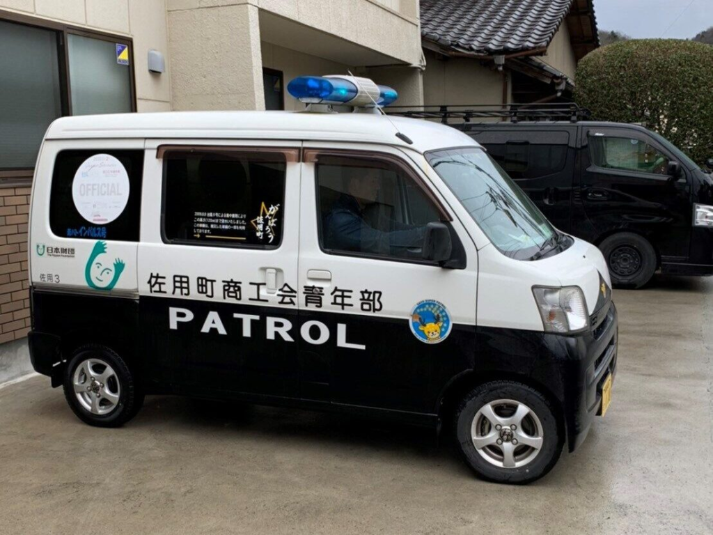子どもたちの安全を守るため、週に1回程度、青色防犯パトロールを実施。旧4町全体を、町内小中学生の下校時間に合わせて巡回しています。