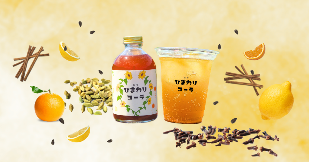 観賞用のひまわりが花後に廃棄されてしまう”もったいない”を、新しい価値に変えるため、ひまわり油の搾油後に出る種のしぼりかすを活用したクラフトコーラを企画しました。